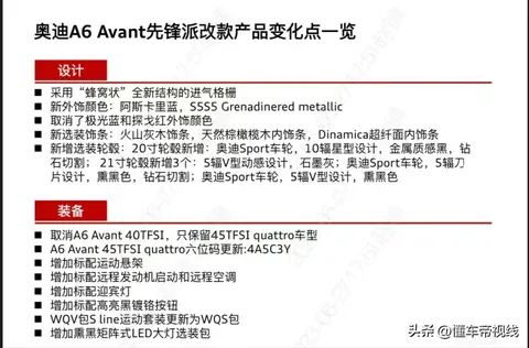 [懂车帝原创 产品] 近日,我们从相关渠道获得2024款奥迪A6 Avant相关配置和价格信息,新车仅保留45TFSI臻选动感型一款车型,预计售价约50.7万元,取消在售的40TFSI豪华动感型(2.0T低功率两驱)。从相关信息判断,2024款车型即将上市。