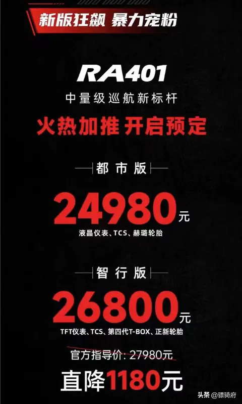 RA401上市时间不久,分为两个版本,都市版和智行版,售价分别为24980元和27980元,这款车一上市就吸引了不少车迷的关注,而更让人意外的是,赛科龙居然很快就对RA401进行了降价,原智行版售价调整为26800元,原都市版售价不变,但是增加了TCS(原智行版标配)。
