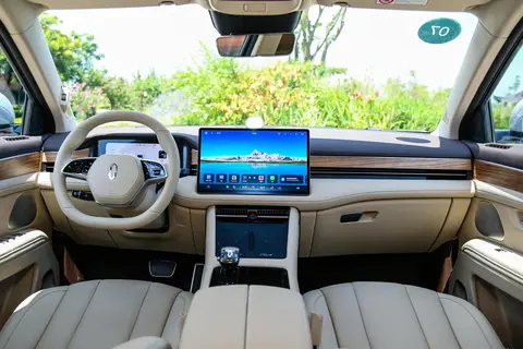 进入车内,双幅式的方向盘、内嵌式的全液晶仪表盘、悬浮式的中控屏和电子挡杆组成了车内的驾驶区域。车机系统为HarmonyOS车载智能操作系统,彰显出不错的科技感。配置上,提供了ADS 2.0高阶智能驾驶辅助系统,支持记忆泊车,自动漫游寻找车位等,在辅助驾驶上表现亮眼。