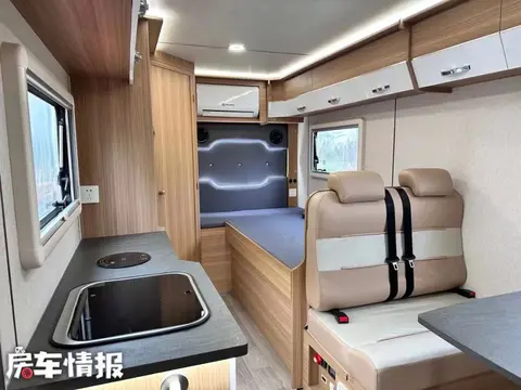 内部生活空间作为一款无拓展房车,其实也是比较够用的,虽然比起带拓展的房车稍微要紧凑了一些,但是设备上可是一点也没减少。整体风格是原木色搭配白色家具,很有轻欧风格。厨房的操作台面是比较宽裕的,配置了洗菜池和一个电磁炉,上下都做了充足的储物空间,用来收纳出行携带的厨具餐具还有一些小的家电。台面一侧是一个容积比较大的衣柜,常用的换洗衣物可以挂在里面,拿取也比较方便。