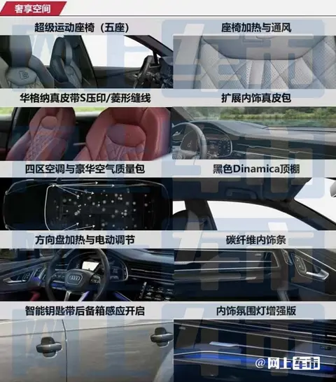 新车共有8种漆色可选,标配高清矩阵LED激光大灯、空气悬挂、全车隔音玻璃、双边四出运动排气和带迎宾效果的LED尾灯。另外奥迪扩展黑光包提供碳纤维风格前后包围、22英寸运动型轮圈、碳纤维换挡把和Audi Sport照地灯等。