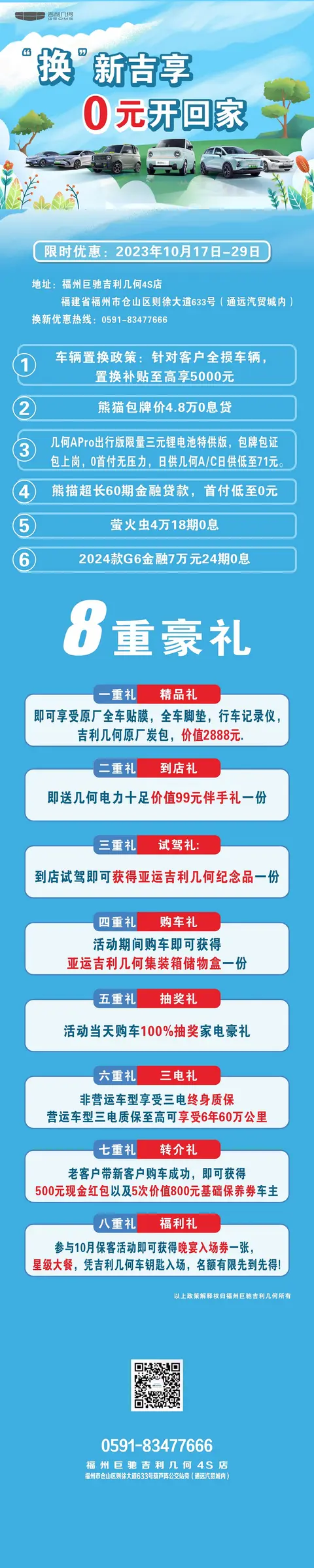 活动地点:福建省福州市仓山区则徐大道633号(通远汽贸城内)福州巨驰吉利几何4S店