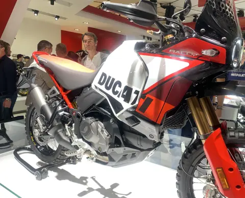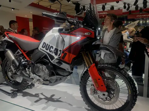 刚刚发布不久的DesertX Rally也是出现在展台上,这款越野性能更强的车型,在外观和配置上都有了新的变化,新的高位挡泥板,减震也更粗,实车看起来更是高大,毕竟座高是910mm。详细信息——我们也要抄近路玩泥巴!杜卡迪全新DesertX Rally发布
