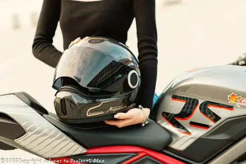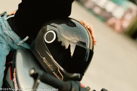 实际使用中,带上速魅的穹顶611首先帅是不用质疑的,毕竟如今市场范围内的可选复古碳纤维头盔屈指可数,而黑金的配色与复古车型又几乎是百搭的存在。然而我们今天要给大家的讲解肯定并不止于此。