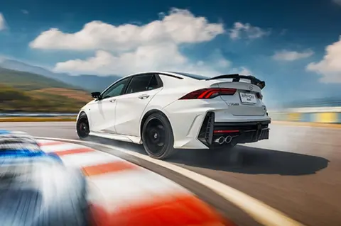 车身侧面,新车提供了19英寸垂尾形运动熏黑轮辋,搭配245/35 R19高性能轮胎,前卡钳还采用了橙色涂装,突出了运动气息。车尾部分,新车增加了原厂镂空尾翼,后包围造型夸张,搭配双边共四出的排气布局,排气声浪还可以通过双模式可开闭功能进行调节。新车提供了象牙白、典雅黑、超星银、哑光皓月灰四种车身颜色可选。