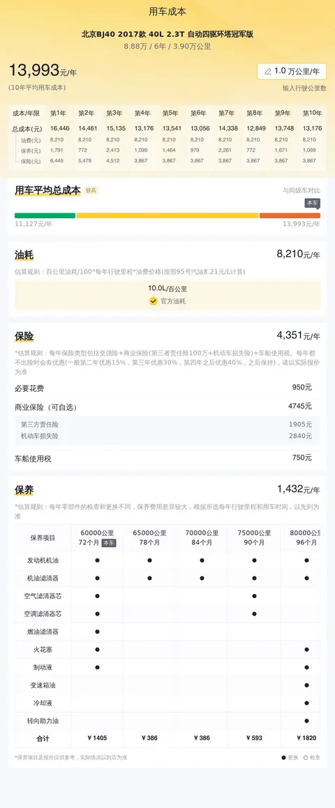 北京BJ40 2017款 40L 2.3T 自动四驱环塔冠军版的用车成本包括年均油耗8200元/年、官方油耗10.0L/百公里、年均保险费4351元/年、年均保养费1432元/年,十年用车成本平均每年为13983元。