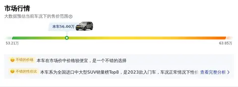 当前,该车的二手车市场行情,最低价格为53.21万,本车的交易价格为56万,最高价格为63.85万。