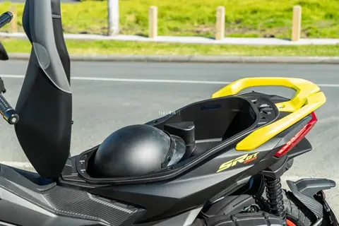 前置手套箱比较局促,仅有左侧配备了一个小的手套箱,内部还被充电接口占据大半。座桶空间表现还行,横向和纵向空间都不错,但深度不够只能放进去半盔和一些随身物品。