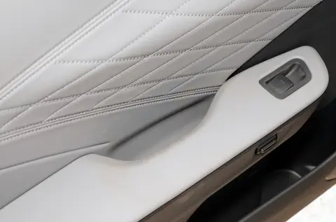 之前的2023款车型内饰实在是有点辣眼睛,比如作为一款重型B级轿车,老款门板内侧还是大面积的黑色硬塑料,看起来很廉价。但这次2024款内饰就舒服多了,大面积的菱形格纹皮革软包覆盖,台面上还穿插了香槟金装饰线条。不过遗憾的是车机系统还没有用上高通主流的芯片,智能化体验如果对比价位类似的自主品牌电动车型,确实还存在差距。