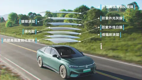 除此之外,ID.7 VIZZION还引入了超大全景智能光感天幕,采用触控方式进行调节。这款天幕具备多重涂层,能够灵敏地变换颜色,使光线更为柔和。开启时,雾度高达95%,而加入低辐射涂层后,热隔效率提升了12%,紫外线隔离率更是达到了99%。