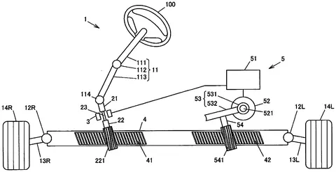 11、转向轴,21、输入轴,22、小齿轮轴,221-541、小齿轮齿,23、扭杆,3、扭矩传感器,4、齿条轴。