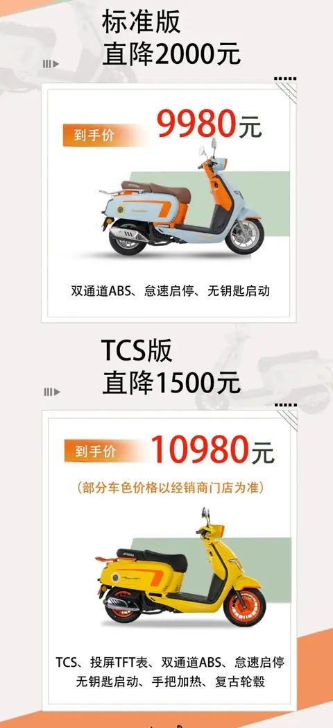 标准版直降2000 ,TCS版直降1500,雅典娜女神150这一次的降幅是真的不小,标准版的售价已经去到了1万以下,直接压缩了很多125小踏板的生存空间。