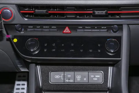 从内部来看,第十一代索纳塔座舱氛围还是挺年轻化的,和外观一样都比较有自己的设计风格。我们看到的这款车座舱内采用了深色调,但在细节之处有很多红色元素装饰,比如中控台风口、座椅边缘、门扶手处、门板处有红色的缝线,带来了视觉撞色,也带了运动感。它的方向盘设计的也是挺有个性的,为三辐设计,同时也支持换挡功能。它的座椅采用了运动风格设计,座椅填充物比较合适,能提供较好的支撑性。