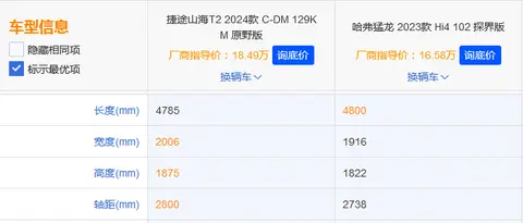车身尺寸方面,和捷途旅行者差别不是很大,长宽高分别为4785x2006x1875mm,轴距为2800mm。从具体参数来看和竞品车型哈弗猛龙相比,车身更宽,轴距更长。