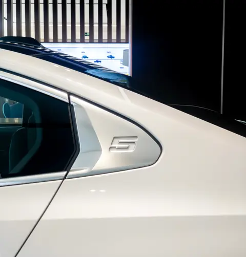 车身侧面是流畅的溜背式过渡,配合连贯的肩线和腰线,勾勒出四平八稳的车身。细节方面,D柱的霍氏拐角上印有数字“5”标识,车门把手修改为内嵌式设计,造型别致的大尺寸轮毂,为车辆增添了一分运动感。