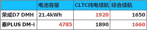 看完动力参数,我们再来看两台车的续航表现。荣威D7 DMH 125km超越版配备了21.4kWh的磷酸铁锂电池,CLTC纯电续航为125公里。秦PLUS DM-i 荣耀版120km领先型配备了18.32kWh的磷酸铁锂电池,NEDC纯电续航为120公里。这部分测试规则统一换成WLTC的,荣威D7 DMH为103km,秦PLUS DM-i为101公里。综合续航方面,荣威D7 DMH CLTC工况综合续航达到了1400公里,官方给出的实测续航更是达到了1962公里。而秦PLUS DM-i的标称续航是1245公里,且未给出测试工况。无论是动力还是续航,这两方面荣威D7 DMH相对秦PLUS DM-i都是有一些优势的。