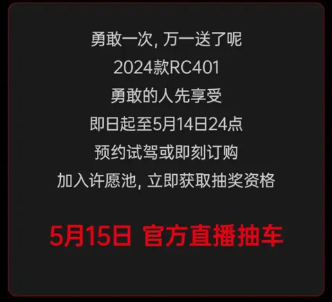 最后,为助力周末的“宗申巾帼杯”中国耐力赛,赛科龙还推出了许愿池活动:凡在5月14号24点前预约试驾或者订车的车友,赛科龙将于5月15号从中抽取一名幸运车友直接送出一台全新的2024款RC401!