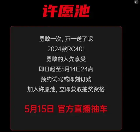 2024款的RC401正式上市,运动版定价22988元,赛道版定价24988元,与老款相比两万出头的定价就说已经够低了吧,但福利远远不止这,还推出了88元抵1000的活动,也就是运动版只要21988元,赛道版只要23988元就可以带回家!这谁看了不说一句壕无人性。但心动的车友要注意了,这次抵扣活动仅限2000名,而且还有抽奖送车活动,一个ID限一台,所以各位拼人品的时候到了。