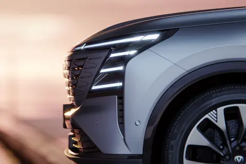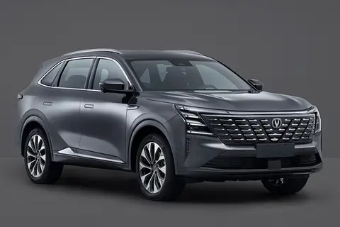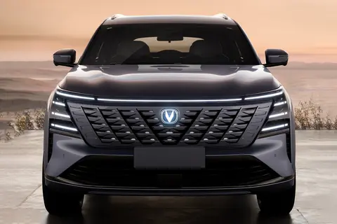 新车外观虽然延续了一些家族式的设计元素,但整体的变化还是相当明显的,将机甲风格和科技感素材进行了整合;前脸呈V字型矩阵式的植入了密集的纹理,长安logo标识也带有发光效果,夜晚点亮后提升了新车的辨识度;上方在拥有贯穿式日间行车灯的同时,下方还植入了三条长短具有规则的横幅式灯带,提升了未来科技感氛围;配合下方延伸出的纵置导流槽和大嘴式的包围进气口,力量感相当强烈。