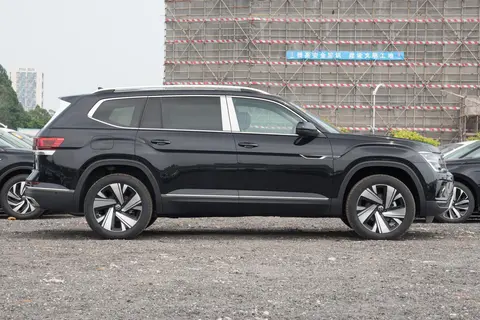 从侧面看上去,车身比较大气。它的车顶拥有行李架,车窗的周围有镀铬亮条进行了装饰,后车窗还有隐私的玻璃设计,能有效阻挡紫外线,也能保护车内乘客的隐私。我们看到,它的车身线条从前大灯一直延伸到尾灯。它的轮毂为风轮样式的设计,轮毂的规格为20英寸设计。途昂的尾部还是挺有设计感的,整体具有较强的层次感。尾灯进行了横穿设计,并进行了熏黑处理;尾灯下方有横穿的亮条进行装饰;尾部有大面积的包围,并有双边双出的排气设计。