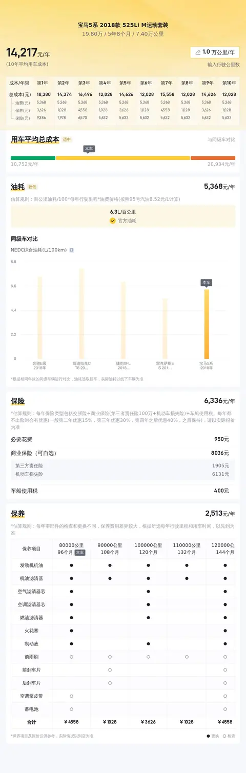 除了了解市场价格,合理的估算用车成本也是必不可少的。根据估算,这辆车年均综合用车成本大概在每年1.4万元左右。当然,具体金额还是要看车辆的实际使用情况而定。