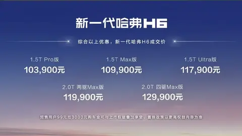 6月19日讯:长城汽车哈弗品牌的新一代哈弗H6(图片|配置|询价)车型正式上市。虽然命名为新一代车型,但实际为中期改款版本,此次新车共推出5款配置,指导价为11.79-14.39万元。不过如今价格战如此激烈,长城汽车还是给出了非常实在的优惠政策,在7月31日之前购车可享累计权益折扣,折后售价区间为10.39-12.99万元。另外,预售用户仍可享99元抵3000元的权益。也就是说综合优惠后新一代哈弗H6的起售价格就在10万元左右。