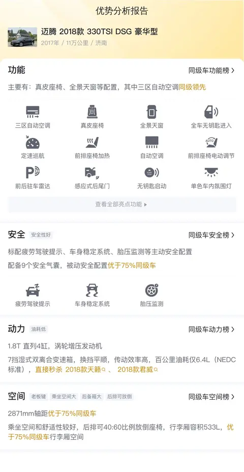 二手车的配置状况往往能直观展现其性价比。接下来,我们将为您介绍这款迈腾 2018款 330TSI DSG 豪华型的配置亮点。