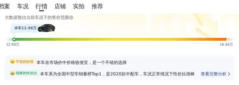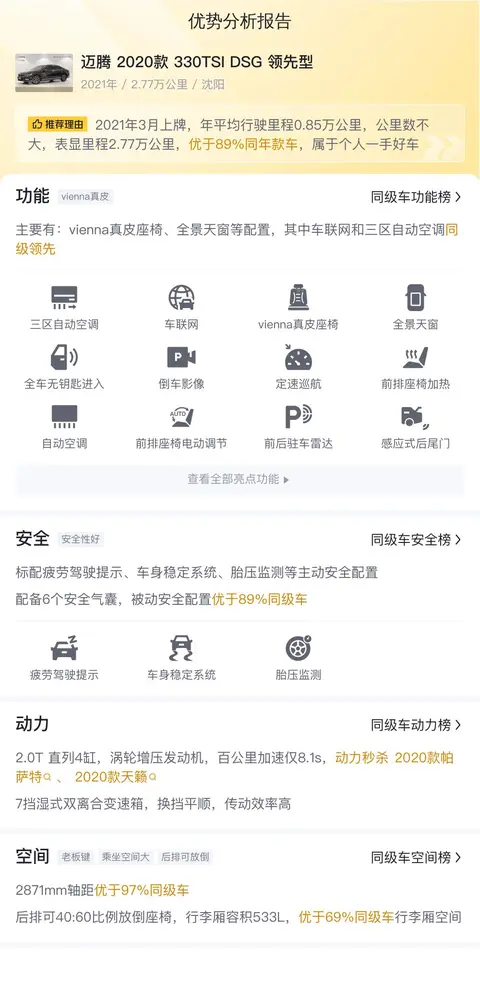 我们挑选了一辆迈腾 2020款 330TSI DSG 领先型,定位中型轿车,车身颜色为黑色,浅色内饰。2021年3月首次上牌,期间过户0次。上牌地为沈阳,表显里程为2.77万公里。新车指导价为21.99万,目前二手车报价12.98万,相比新车价格便宜了9.01万。