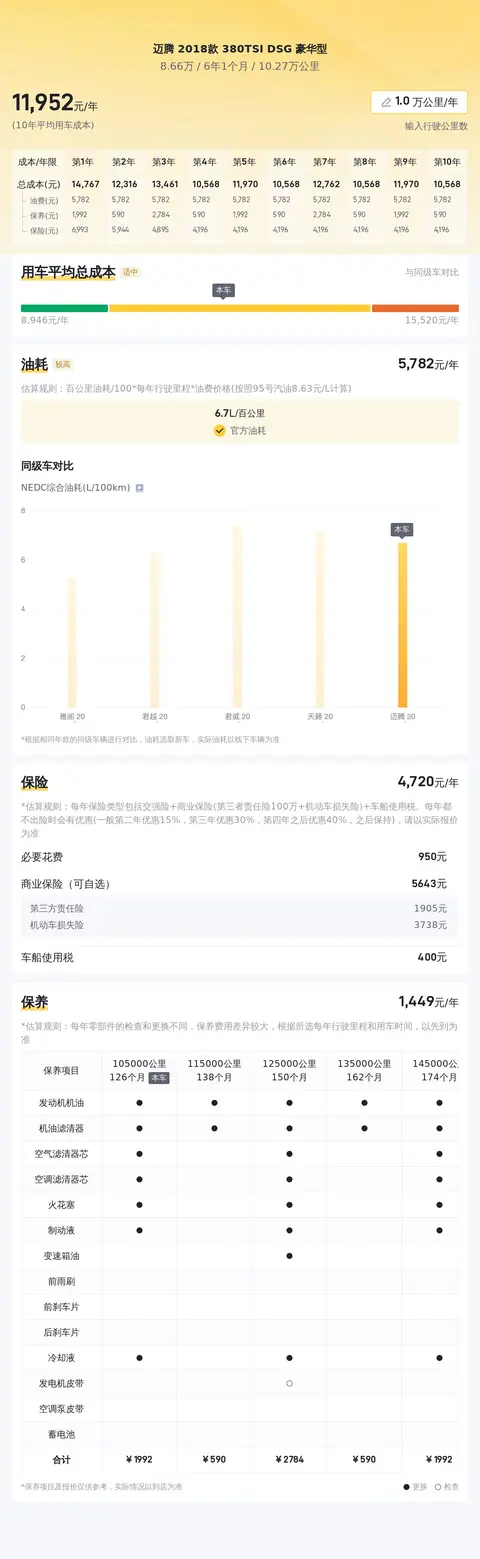 目前的二手车市场,这款迈腾的行情价在8.67万到11.04万之间,而它的报价仅为8.66万,性价比很高。另外,根据估算,这辆车的10年平均用车成本为12273元/年,与同级车相比处于较低水平。