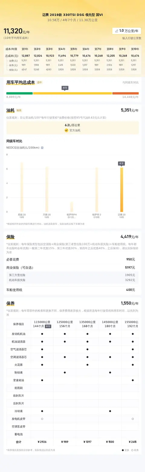 用车成本方面,根据估算,这辆车年均综合用车成本大概在每年1.1万元左右。当然,具体的用车成本会根据车主的用车习惯和环境等因素有所差异。