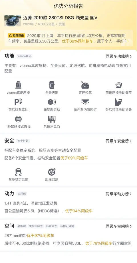 总结:总的来说,这辆二手迈腾 2019款 280TSI DSG 领先型 国V在安全性、动力性和舒适度方面有着不错的表现,同时价格也相对合理。当然,具体选择还需根据个人需求和预算来决定。希望这些信息能够帮助您更好地了解这款车。