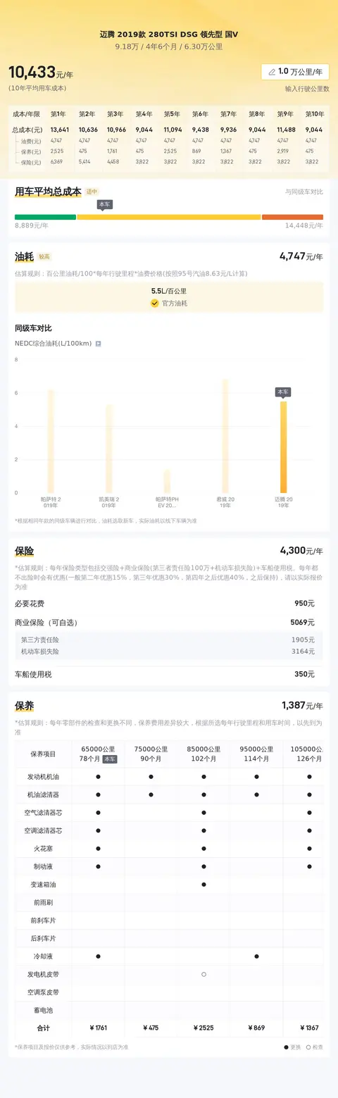 这辆车的市场行情价格在9.13万至11.41万之间,它的报价9.68万,相对适中,同时保值率也较高。此外,据估算,它10年平均用车成本约9909元/年,而同级车的最低10年平均用车成本为7629元/年,最高为1.5万元/年。