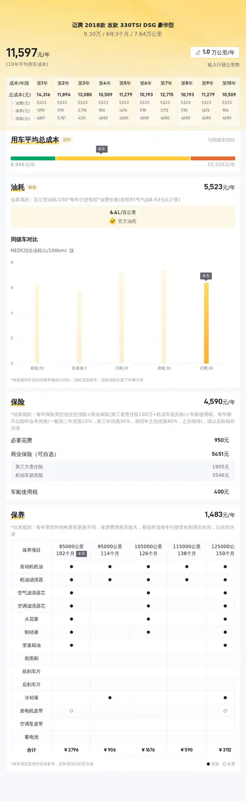 根据懂车帝网站的大数据统计,这款车的10年平均用车成本为11928元/年,而同级车的最低10年平均用车成本为8623元/年,最高为13134元/年。因此,这款车的用车成本处于中等水平。但考虑到其出色的性能和品质,这一成本还是可以接受的。