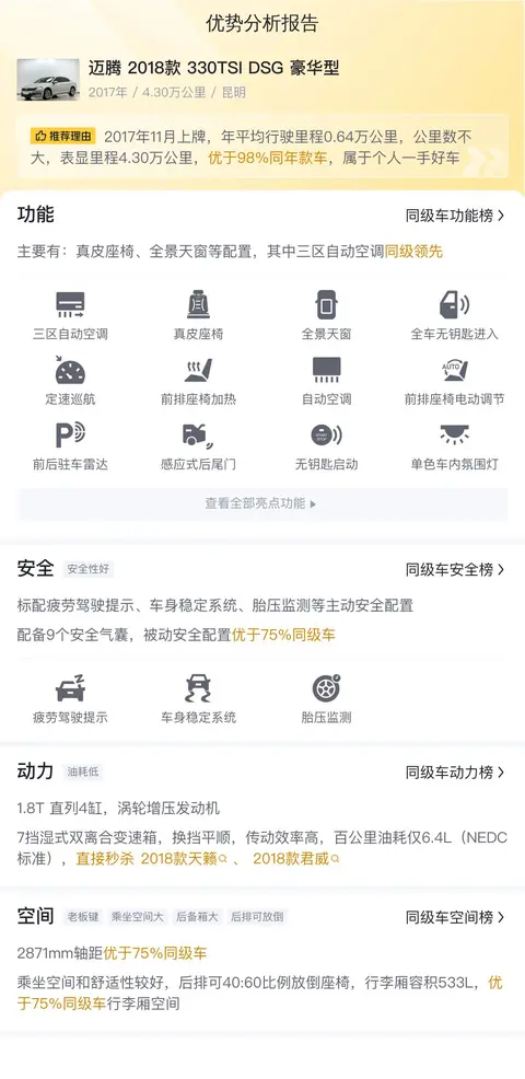 本篇内容针对迈腾2018款 330TSI DSG豪华型进行了全面的市场行情分析,旨在为您提供一个清晰的购车视角。通过与同级车型的比较,我们发现它在安全配置、动力性能、舒适性等方面均表现出色。在安全配置方面,它配备了多项主动安全配置,如疲劳驾驶提示、车身稳定系统、胎压监测等,以及10个安全气囊,为驾乘人员提供了全方位的安全保障。在动力性能方面,它搭载的1.8T直列4缸涡轮增压发动机,最大扭矩达到300N·m,与7挡湿式双离合变速箱相匹配,换挡平顺丝滑,传动效率高,为驾驶者带来了出色的驾驶体验。在舒适性方面,它配备了真皮座椅、全景天窗、自动空调等配置,为乘客提供了舒适的乘坐环境。此外,它的车内空间宽敞,储物空间丰富,能够满足家庭出行的需求。总的来说,迈腾2018款 330TSI DSG豪华型是一款性价比高的中型车,值得消费者考虑。