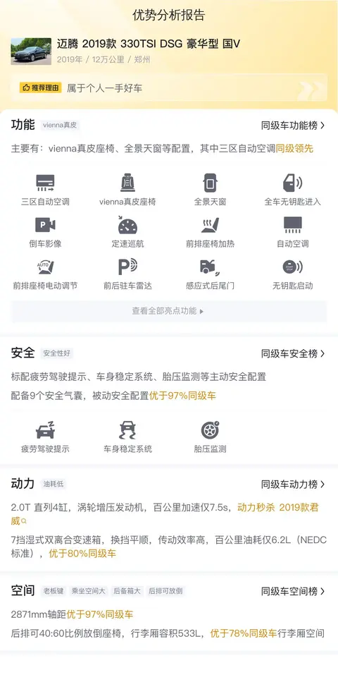 此车具体版本为——迈腾 2019款 330TSI DSG 豪华型 国V,2019年8月首次上牌,在此期间过户0次。此车上牌地和车源地均为郑州,表显里程12万公里。新车指导价22.91万元,二手车报价8.48万元,相较新车指导价便宜了14.43万元。