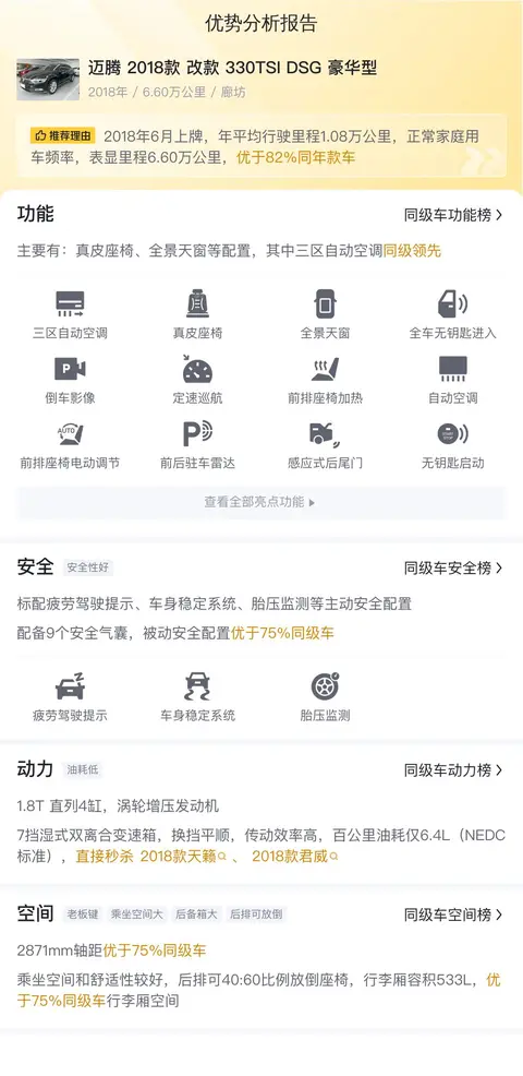 迈腾 2018款 改款 330TSI DSG 豪华型在对比同级车的多项数据中表现出色,其后排空间、行李厢空间、安全气囊数量以及动力性能均优于大部分同级对手。此外,该车在燃油经济性和舒适配置方面也展现出一定的优势。