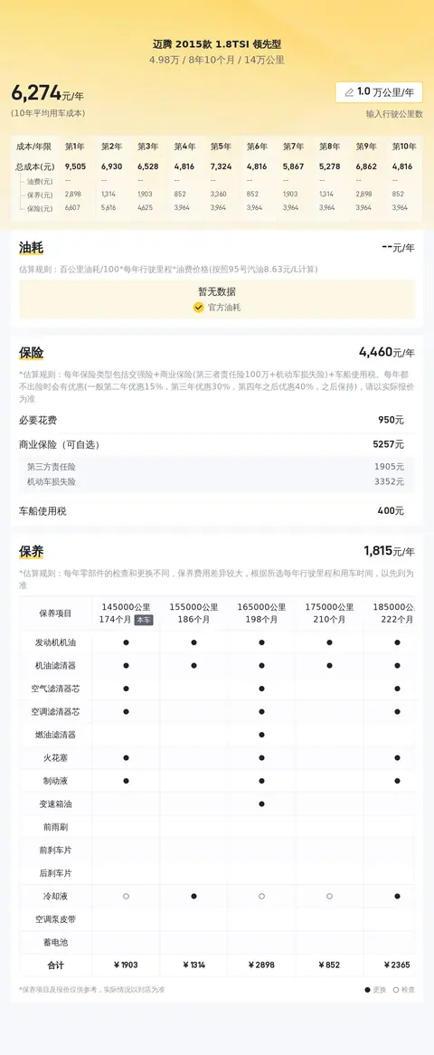 用车成本方面,按一年行驶一万公里计算,该款车每年燃油、保险及保养的综合用车成本约7944元,十年平均用车成本约7021元,十年最高用车成本约8866元,十年最低用车成本约5177元。十年后的用车成本会随车龄增长而降低。