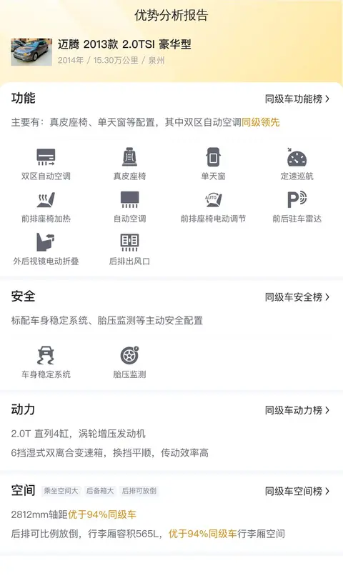 本次介绍的车型为迈腾 2013款 2.0TSI 豪华型,定位中型轿车,香槟色外观,上牌地及车源地均为泉州,上牌日期2014年5月,表显里程15.30万公里,有1次过户记录,新车指导价24.78万,二手车报价5.68万,该车符合国IV排放标准。