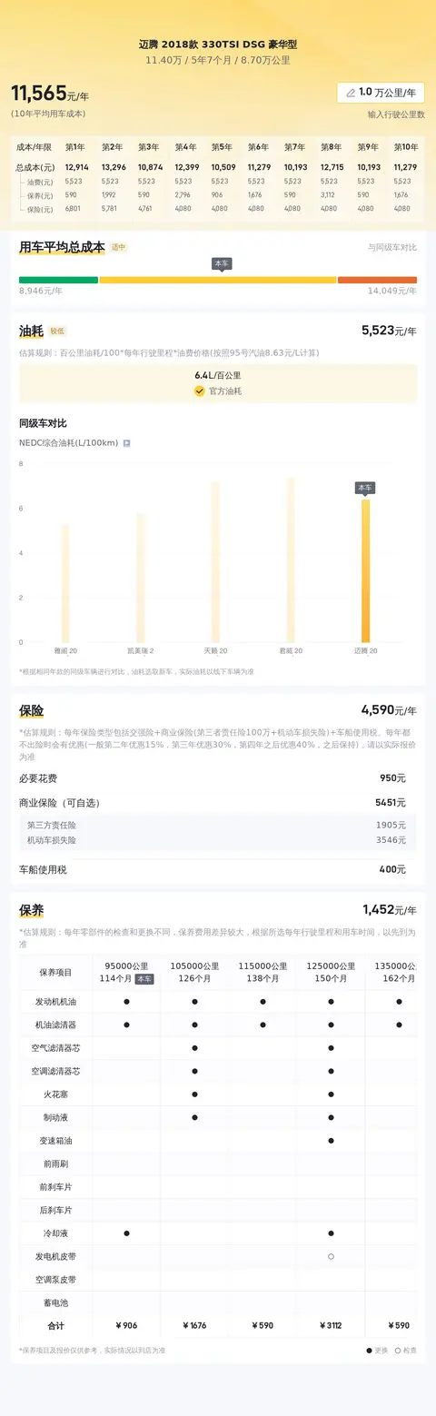 目前市场上这款二手迈腾的售价大约在8.65万至10.83万元之间,而本文中的这辆迈腾报价为11.4万元,价格略高于市场行情,但考虑到其良好的车况和丰富的配置,这个价格也是合理的。在用车成本方面,根据估算,这辆车的年均综合用车成本约为1.2万元,当然这个费用会根据车主的用车习惯和环境而有所不同。