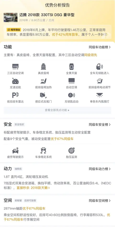 此车具体版本为——迈腾 2018款 330TSI DSG 豪华型,定位中型车,2018年6月首次上牌,0过户,表显里程8.90万公里,牌照及车源所在地均在兰州,外观颜色为香槟色,内饰颜色为深色。新车含税指导价为25.53万,而现二手车报价为10.30万。