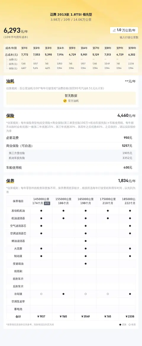这辆迈腾2013款 1.8TSI 领先型的二手车行情大致在3.75万至4.87万之间,目前该车报价3.98万元,价格处于适中水平。10年平均用车成本大约为每年1.0万元左右,具体费用要看车辆的使用情况而定。