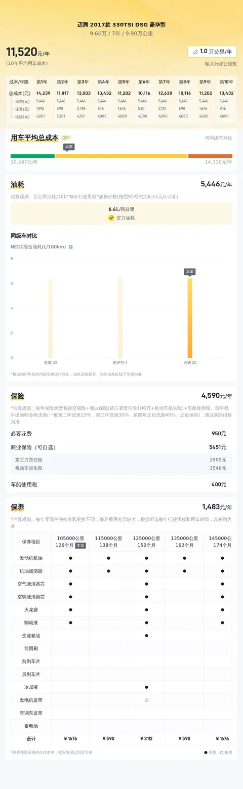 当前市场上,这款迈腾的二手车行情大致在8.94万至11.29万之间。根据估算,这辆车年均综合用车成本大概在每年1.2万元左右。当然,实际费用会根据车主的用车习惯和环境等因素有所差异。