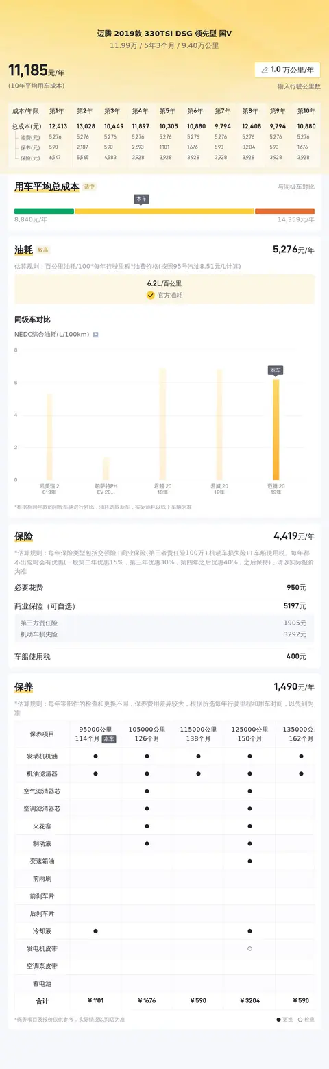 它的保值率是56.36%,目前的二手车行情是9.71万-11.91万,它的报价则是11.99万,报价略高于市场行情,但也在合理范围内。另外,据估算,这辆车的10年平均用车成本是10989元/年,而同级车的最低是8030元/年,最高是11722元/年,所以它的用车成本是比较高的。