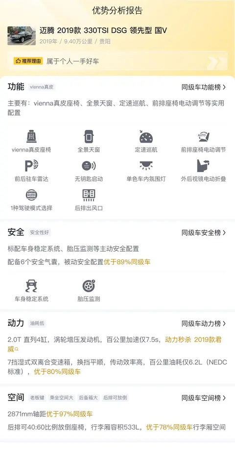 优势方面,这辆迈腾的用料做工都比较扎实,车内空间宽敞,乘坐舒适,动力强劲,操控灵活,安全配置丰富,性价比高。