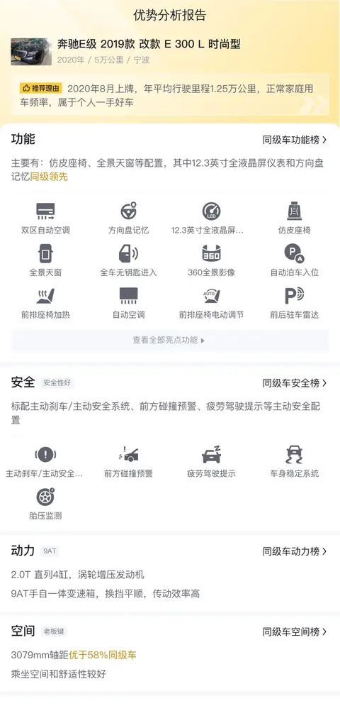 总结:这款奔驰E级 2019款 改款 E 300 L 时尚型是一款性能出色、配置丰富的豪华轿车。虽然作为二手车,但经过严格的检测和维护,其品质仍然值得信赖。如果您正在寻找一款性价比高的豪华轿车,那么这款车绝对值得您考虑。