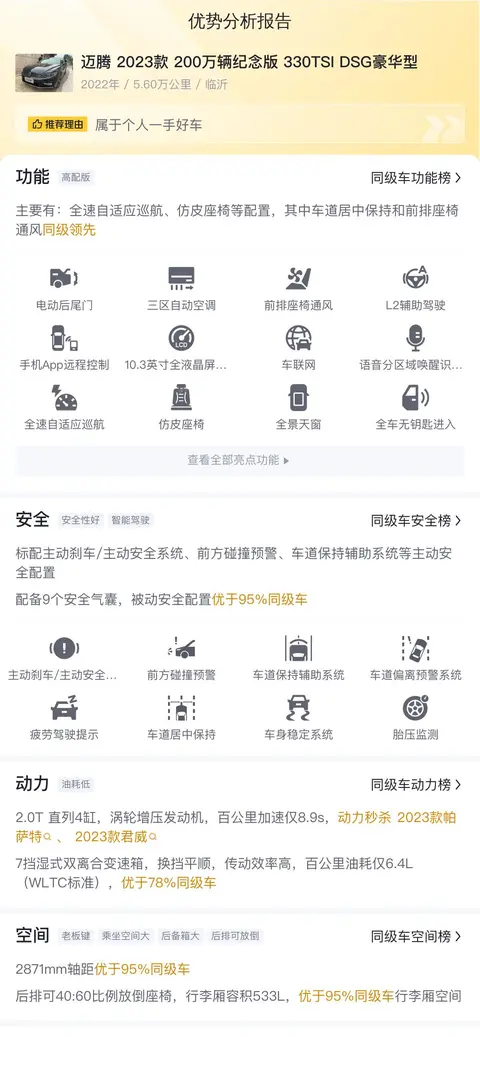 综上所述,我们所介绍的这款迈腾 2023款 200万辆纪念版 330TSI DSG豪华型在两年的时间里行驶了5.6万公里,这个数字属于正常水平。这款车的配置比较丰富,如三区自动空调、前排座椅通风、方向盘加热等配置,为驾乘者带来了良好的舒适性和便利性。同时,其并线辅助、疲劳驾驶提示等安全配置也提升了行车安全性。需要注意的是,我们暂未获得这辆车的检测报告,车况详情还需要您实地检验。希望我们的介绍能帮助您更好地了解这款车,并为您的购车决策提供有价值的参考。