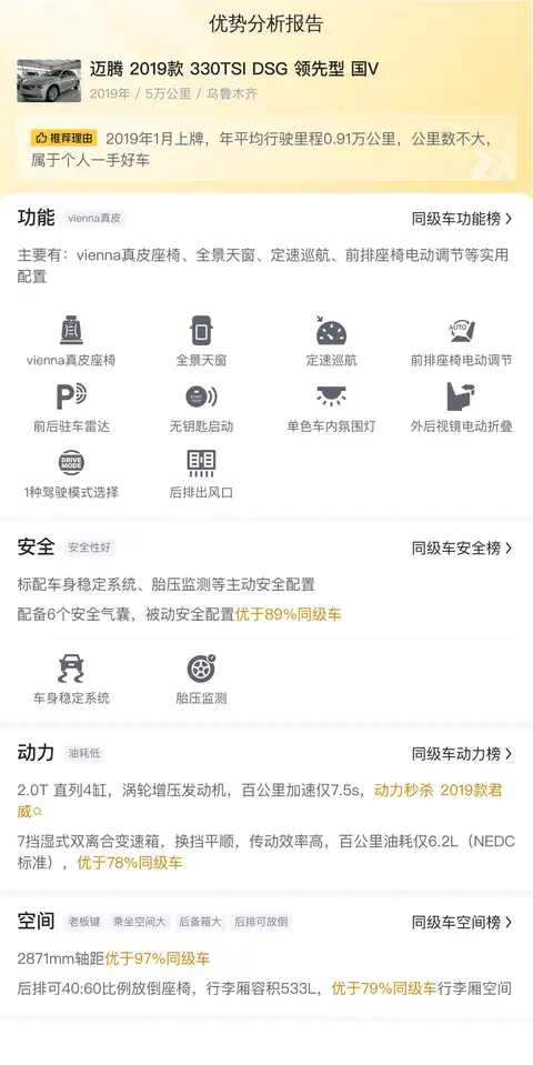 据估算,同级车的最低用车成本是6507元/年,最高是13772元/年,而迈腾 2019款 330TSI DSG 领先型 国V是10663元/年,所以用车成本适中。