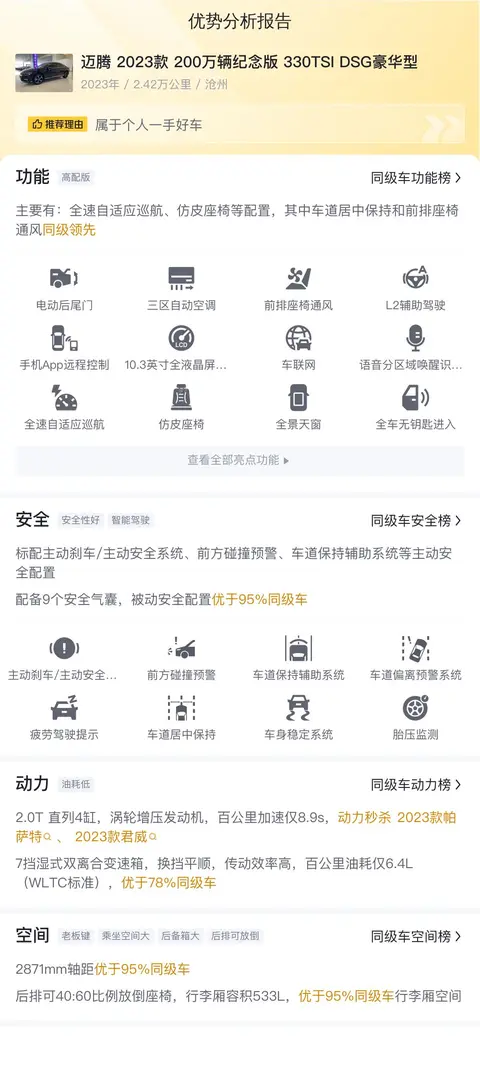 综上所述的新车含税价、用车成本、市场行情、优势分析、同款比价等数据仅供参考。在配置部分,因为二手车非标品,车辆可能会存在配置改装的情况,具体车况信息需要线下结合车辆实际情况进行综合参考。