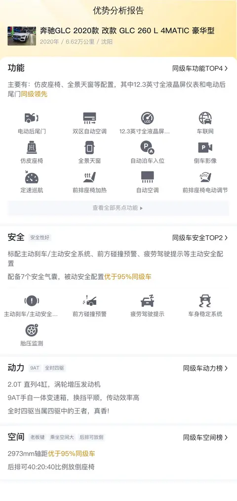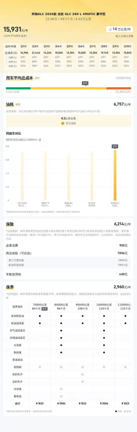 据估算,同级车的最低用车成本是12798元/年,最高是18771元/年,奔驰GLC 2020款 改款 GLC 260 L 4MATIC 豪华型是15535元/年,所以不算低。