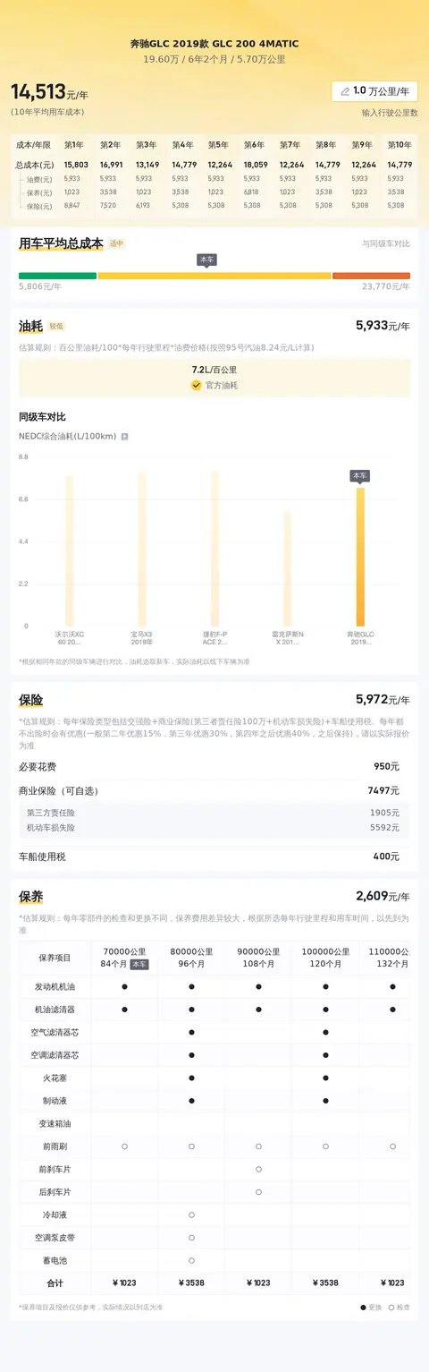 在市场行情部分,当前这款奔驰GLC的二手车行情在15.96万至19.52万之间,当然具体的售价因车况而有所不同。而在用车成本方面,这辆车的年均综合用车成本约为1.5万元左右,这项开销具体金额跟车主的驾驶习惯和行车环境有直接关系。